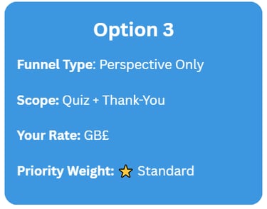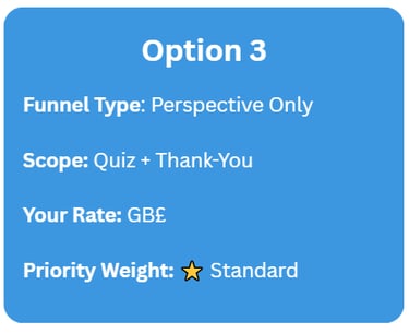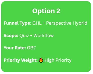 Option 1 funnels feed Hybrid builds where Perspective isn’t yet client-approved, while Option 3 serves early-stage Members needing a quiz funnel before full automation.
